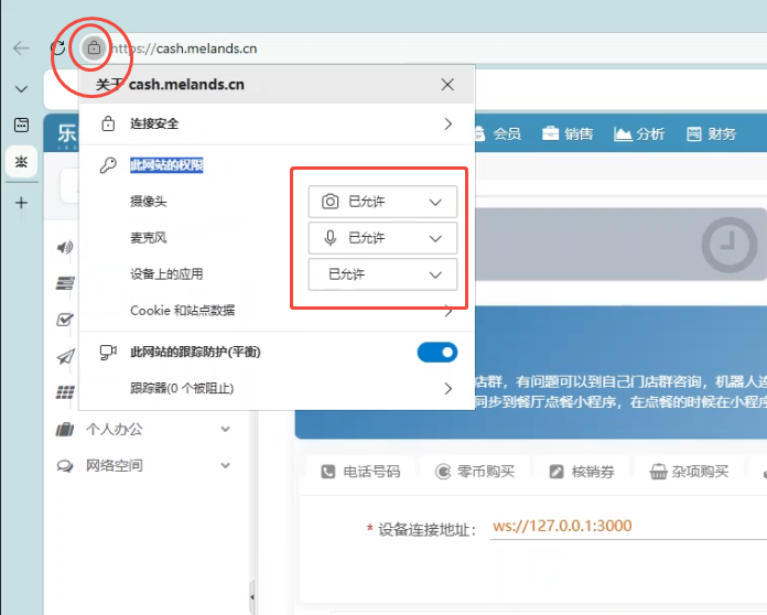 ### 1.打开收银系统,提示设备连接已断开 检查收银程序是否打开,电脑右下角查看图标   ### 2.如果收银程序已打开,检查浏览器设备上的应用是否设置已允许。参考下图