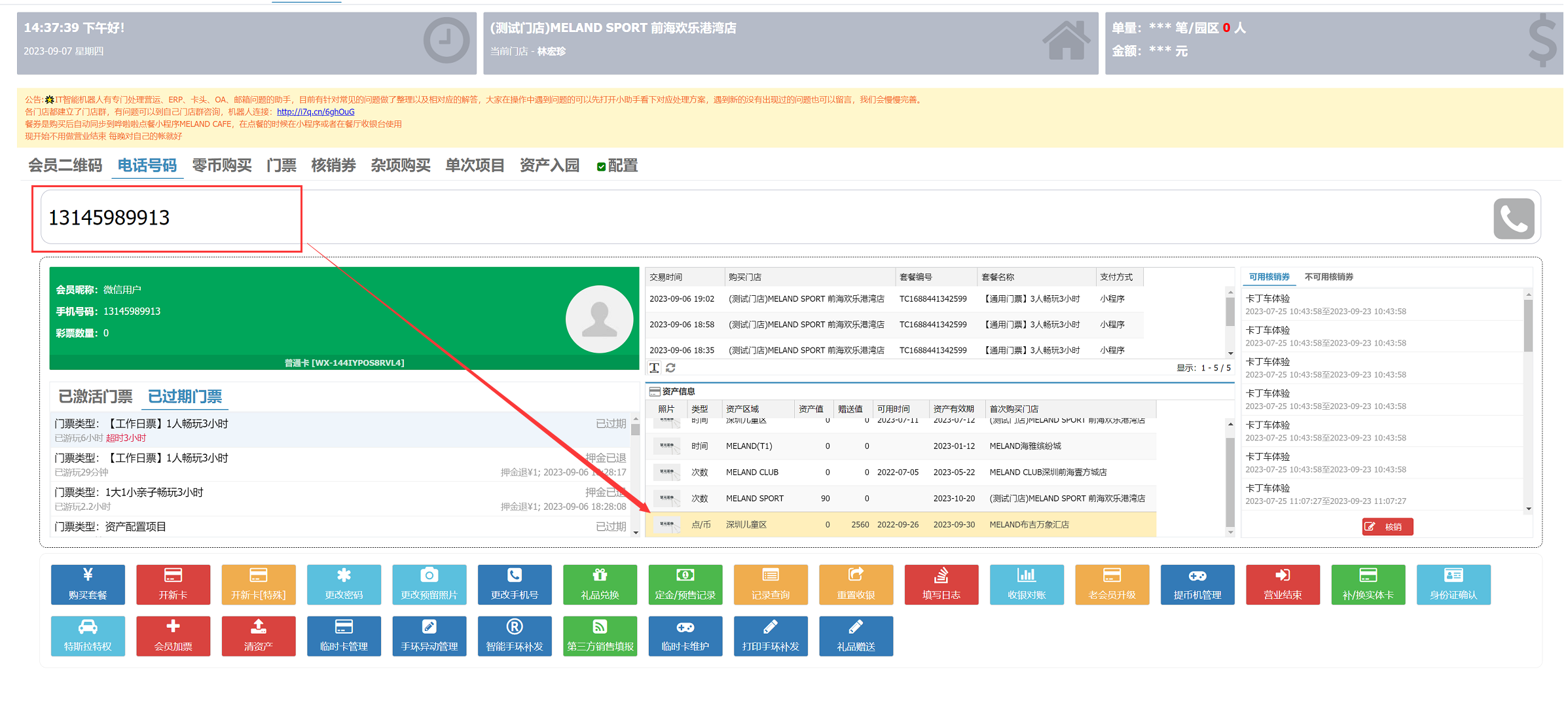 ### 路径:销售-收银系统 ### 1、扫描会员二维码或输入电话号码获取客户信息;选择资产信息,点击点币或次数  ### 2、点击==单次项目==,在单次项目列表中选择一个门票  ### 3、选择一个门票,例如选择【工作日票】1人3小时。点击后弹框扣除客户的点币或次数。  ### 4、购买成功后,绑定入园手环,把手环交给客户激活缴纳押金后入园。  ### == 特别注意;SPORT点/币&次卡兑换门票(手环),不能操作资产入园模块。==