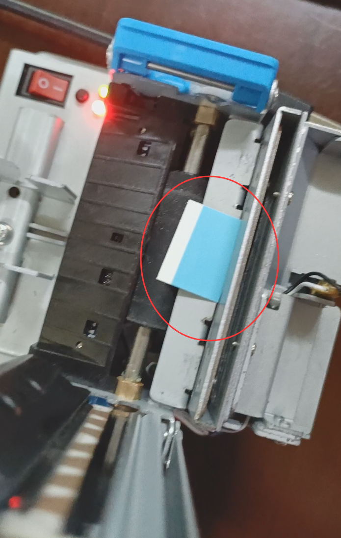 ### 如取票机整卷纸打印完毕后,更换纸的时候一定要检查有没有剩余的手环在打印机里,如果有必须先拿掉,不然会卡纸  ## 再次强调:更换打印纸时,**必须先拿掉剩余的这一点纸,不然会卡纸!!**